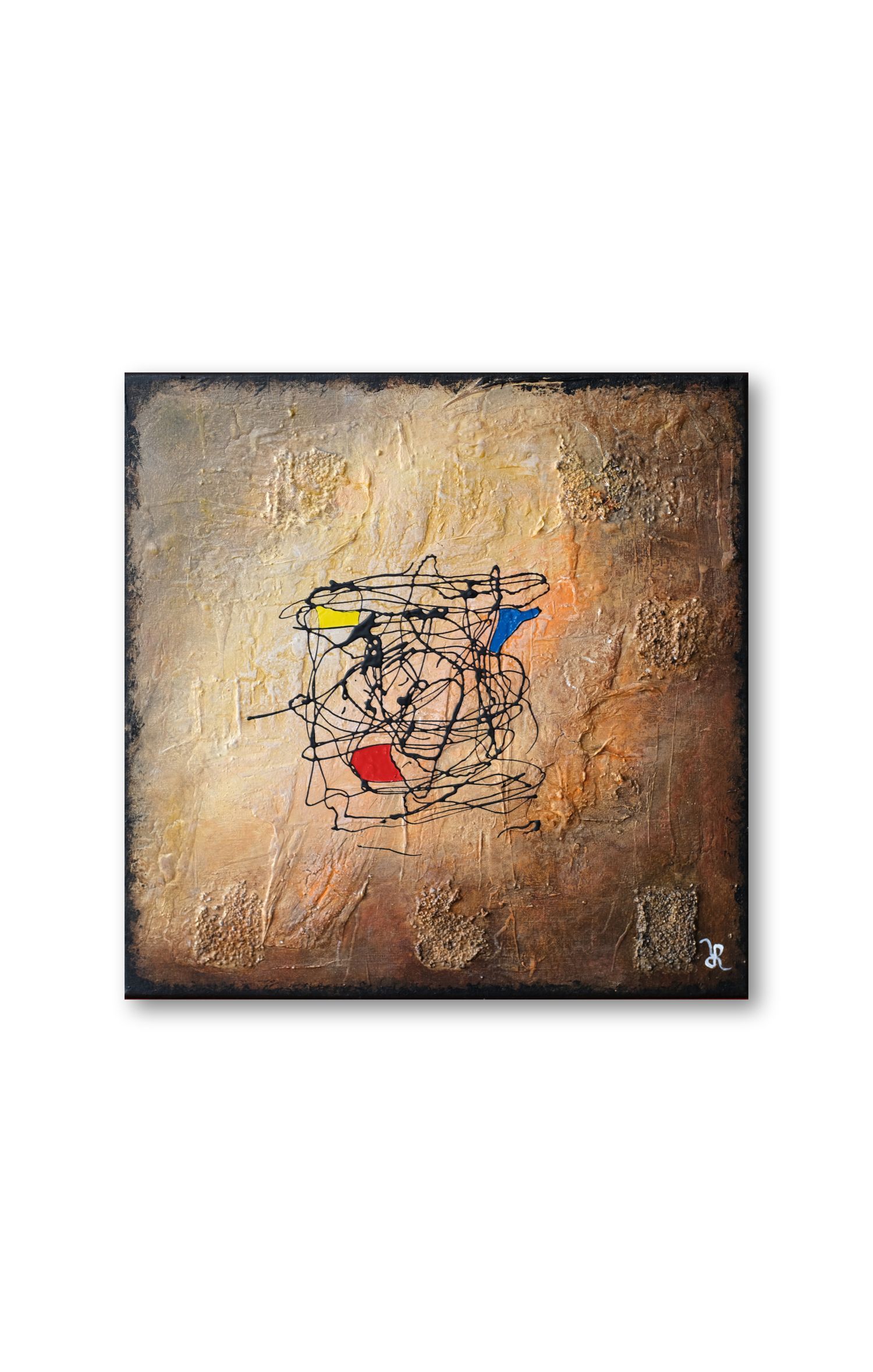 "Enigma Nr. 1," a captivating abstract painting, fluid strokes of dark, aged brown create a rich and mysterious background. The movement of the paint forms organic spaces, each filled with vibrant hues of red, blue, and yellow. These bursts of color stand in striking contrast to the deep, earthy tones, inviting the viewer to explore the interplay between the somber and the vivid, the defined and the ambiguous. The composition evokes a sense of enigma, challenging perceptions and engaging the imagination in a dance of color and form.